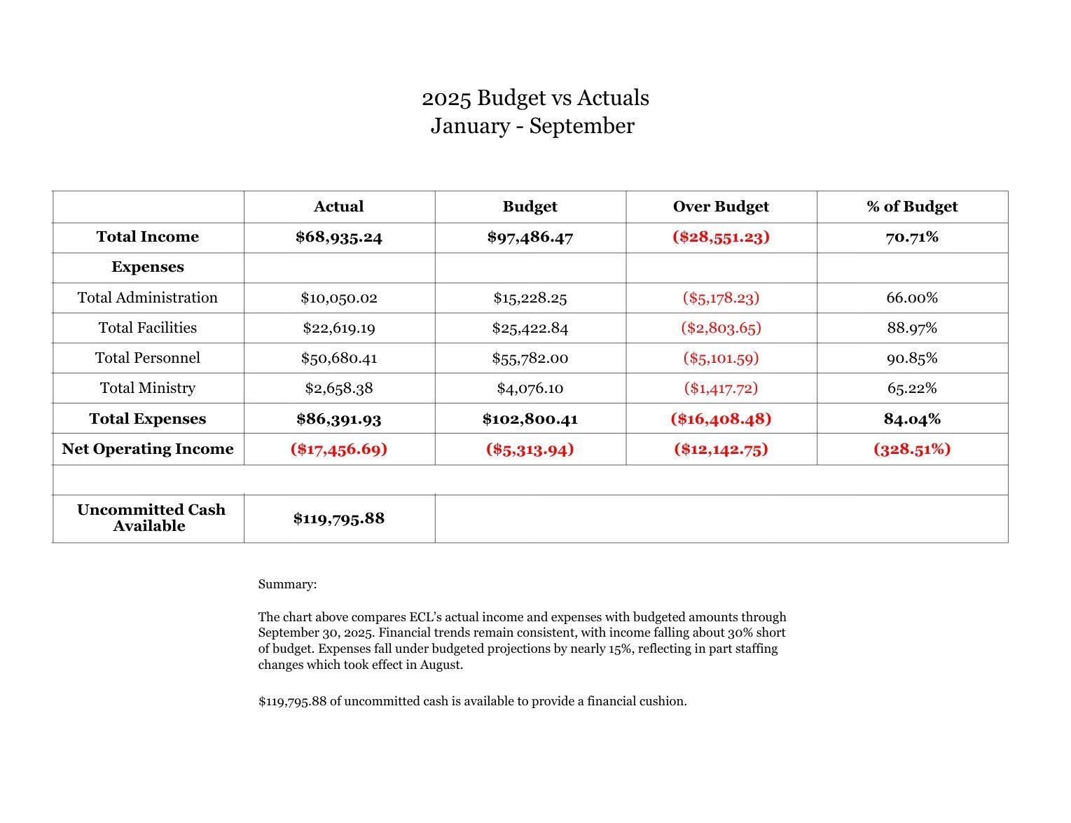 The chart below compares ECL’s actual income and expenses with budgeted amounts through September 30, 2o25. Financial trends remain consistent, with income falling about 30% short of budget. Expenses fall under budgeted projections by nearly 15%, reflecting in part staffing changes which took effect in August.