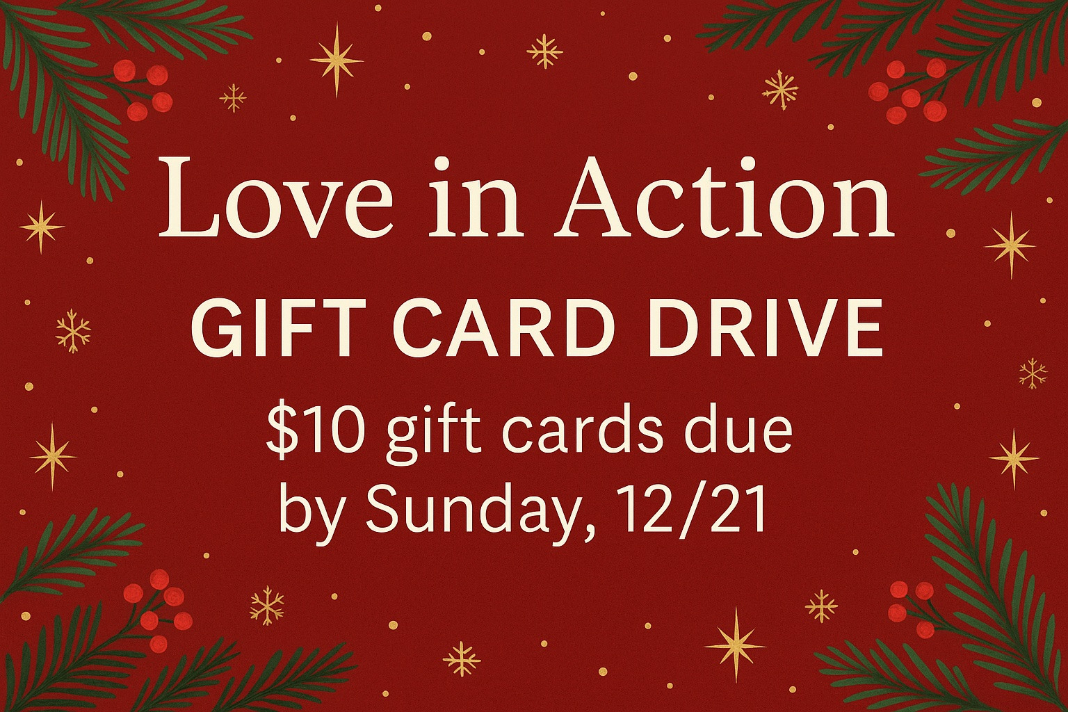 This Advent, we invite you to take part in our Love in Action Gift Card Drive. A ten dollar gift card to a gas station, grocery store, Walmart, or fast food restaurant can make a meaningful difference for someone in our community. All gifts are due by Sunday, December 21. Let’s spread love in practical, tangible ways.